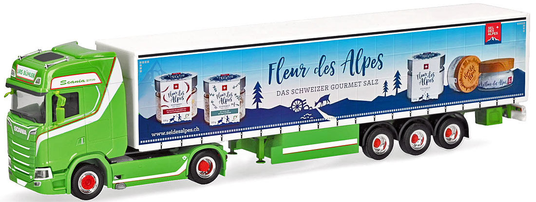 Herpa 321525 Scania CS 20 Hochdach Gardinenplanen-Sattelzug Urs Bühler - Fleur des Alpes Schweiz