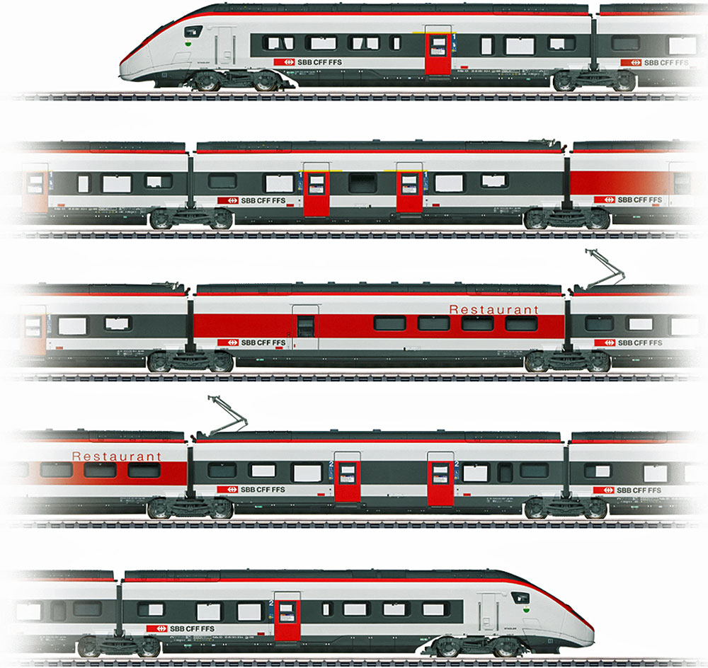 SBB Hochgeschwindig-keits-Triebzug RABe 501 004 Giruno Ep VI Vorbild: Elektrischer Hochgeschwindigkeits-Triebzug EC 250 als RABe 501 Giruno der 1 Endwagen A (Bt1), 2. Klasse. 1 Mittelwagen D (B9), 2. Klasse mit Pantograph. 1 Mittelwagen E (B8), 2. Klasse. 1 Mittelwagen F (B7), 2. Klasse, mit behindertengerechten Einstiegen und Pantograph. 1 Mittelwagen G (WR6), mit Restaurant-Bereich. 1 Mittelwagen H (A5), 1. Klasse, mit Behinderten-Einstiegen und Pantograph. 1 Endwagen