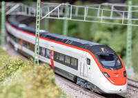 Vorbild : Elektrischer Hochgeschwindigkeits-Triebzug EC 250 als RABe 501 Giruno der Schweizerischen Bundesbahnen (SBB). 1 Endwagen A (Bt1),2. Klasse. 1 Mittelwagen F (B7), 2. Klasse, mit behindertengerechten Einstiegen und Stromabnehmer. 1 Mittelwagen G (WR6), mit Restaurant-Bereich. 1 Mittelwagen H (A5), 1. Klasse, mit Behinderten-Einstiegen und Stromabnehmer. 1 Endwagen L (At2), 1. Klasse. Mehrsystem-Triebzug. Nachbildung des EC 151, mit grenzüberschreitendem Zuglauf: Frankfurt/Main – Freiburg – Basel – Zürich – Milano Centrale. Zug-Nummer RABe 501 022, mit Wappen des Kantons Vaud. Betriebszustand um 2024. |