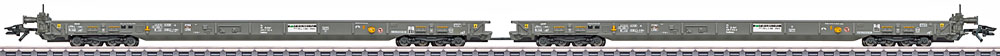 Hupac Rollende Landstrasse 2-teiliges Set Zwei Niederflurtransport-wagen Bauart Saadkmms der RAlpin AG (Olten), für den Transitverkehr der Rollenden Landstrasse. Quarzgraue Grundfarbgebung. Betriebszustand ab 2018. |