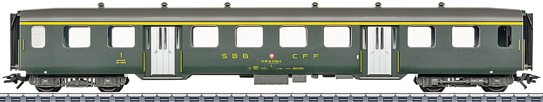 SBB Leichtstahlwagen 1. Klasse mit vierflügeligen Türen und zwei Einstiegen je Seite. Farbgebung Tannengrün. Betriebszustand um 1990. Modell: Wagen in tannengrüner Farbgebung und mit Faltenbalg-Ausrüstung entsprechend der Ursprungs-Ausführung. Vorbereitet für Stromführende Kupplungsdeichseln 7319 oder Stromführende trennbare Kurzkupplungen 72020/72021 und Innenbeleuchtung 73400/73401 oder 73410/73411. Länge über Puffer ca. 26 cm.