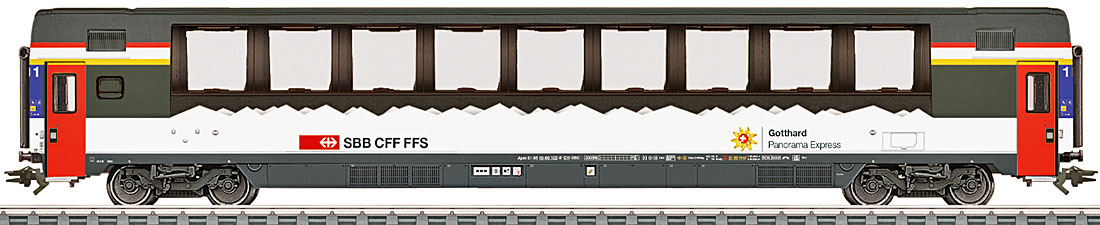 SBB Panoramawagen Apm 1. Klasse Betriebszustand 2025. Verstellbare Puffer. Vorbereitet für Stromführende Kupplungen 7319 oder Stromführende trennbare Kurzkupplungen 72020/72021 sowie zum Einbau einer Innenbeleuchtung 7316. Länge über Puffer ca. 26,7 cm.