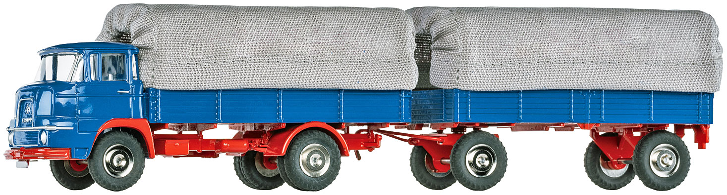 Krupp Pritschen-LKW Frontlenker mit Anhänger Aufbau des LKW aus Metall-Druckguss, Boden aus Stahlblech. Metallräder als Drehteile mit Gummireifen. Kühlergrill, Scheinwerfer, Rücklichter und weitere Details farblich abge |