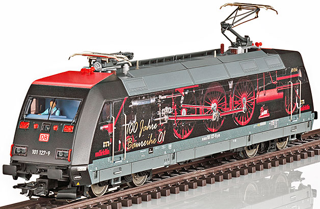 DB-AG Schnellzuglokomotive Baureihe 101 127-9. Werbegestaltung 100 Jahre BR 01. Betriebszustand 2025. Demnächst auch im Original unterwegs Attraktive Gestaltung anlässlich 100 Jahre Baureihe 01. Demnächst auch im Original unterwegs. Mit Pufferspeicher zur Überbrückung von kurzen stromlosen Stellen. Mittelmotor, Antrieb auf alle 4 Achsen. Führerstandbeleuchtung. Kulissengeführte Kupplung. Digital-Decoder mfx+.Mit Pufferspeicher zur Überbrückung von kurzen stromlosen Stellen.