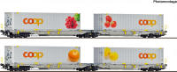 Doppeltaschen-Gelenkwagen T2000 2-teilig Set 1 mit Coop Container passend zu der Coop Lok Modell exklusiv bei ROCO erhältlich Erstmals mit vorbildgerechter Verladebrücke, voll funktionsfähig für den Anlagenbetrieb Komplett neu konstruierter Reefer-Container Wagen aus Metalldruckguss |