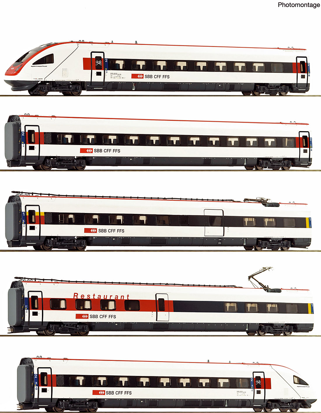SBB ICN RABDe 500 039-8 5-tlg. Set Seit langer Zeit wieder im ROCO-Sortiment Modell technisch komplett überarbeitet Erstmals als Epoche VI-Modell im aktuellen Betriebszustand Ausführung ohne INTEGRA-Magneten an den Drehgestellen In den Digitalausführungen mit schaltbarer Innenbeleuchtung, Führerstandsbeleuchtung und beleuchteten Tischlampen im Restaurant-Wagen Mit Taufnamen Auguste & Jacques Piccard