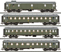 Schnellzugwagen-Set zur Dampflok BR 19.0 Sachsenstolz 4 Schnellzugwagen der Einheitsbauart 1928-30 und 1923 Hecht der Deutschen Reichsbahn der DDR (DR/DDR). 1 Schnellzug-Gepäckwagen Pw4ü-29. 1 Schnellzugwagen C4ü-28, 3. Klasse, Ordnungsnummer 1. 1 Schnellzugwagen C4ü-23 Hecht, 3. Klasse, Ordnungsnummer 2. 1 Schnellzugwagen ABC4ü-29, 1./2./3. Klasse, Ordnungsnummer 4. Zuglauf für den Schnellzug D 11: Dresden-Warnemünde, mit Kurswagen Praha-Kobenhavn Wagen mit Ordnungsnummer 4. Alle Wagen in flaschengrüner Grundfarbgebung. Betriebszustand Epoche IIIa, Anfang der 1950er Jahre. |