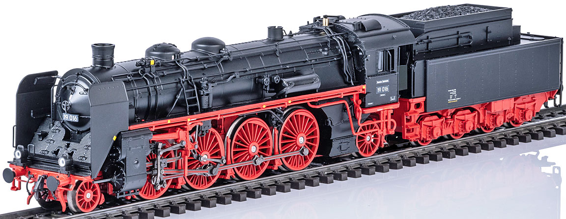 Schnellzug-Dampflokomotive Baureihe 19 016 Sachsenstolz (Sächsische Gattung XX HV), mit sächsischem Kohlen-Schlepptender 2´2 T31. Deutsche Reichsbahn der DDR (DR/DDR). Mit grossen Windleitblechen. Betriebszustand Epoche IIIa, Anfang Komplette Neuentwicklung. Besonders filigrane Metallkonstruktion. Eine Vielzahl angesetzter Details. Serienmässig mit Raucheinsatz und geschwindigkeitsabhängigem, dynamischem Rauchausstoss. Führerstandbeleuchtung und Feuerbüchsenflackern digital schaltbar. Spielewelt-Decoder mfx+ mit umfangreichen Betriebs- und Sound-Funktionen. Pufferhöhe an Lok und Tender nach NEM. Mit Pufferspeicher zur Überbrückung von kurzen stromlosen Stellen. |
