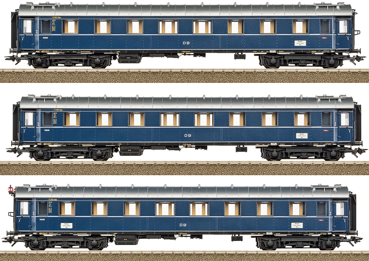 DB Personenwagen-Set „Dom Pfeil“ Drei F-Zug-Reisewagen der Einheitsbauart 1928 bis 1930 (Verwendungsgruppe 29) der Deutschen Bundesbahn (DB) Alle Wagen mit serienmäßig eingebauter LED-Innenbeleuchtung und Pufferkondensator. Mehrfarbige Inneneinrichtungen |