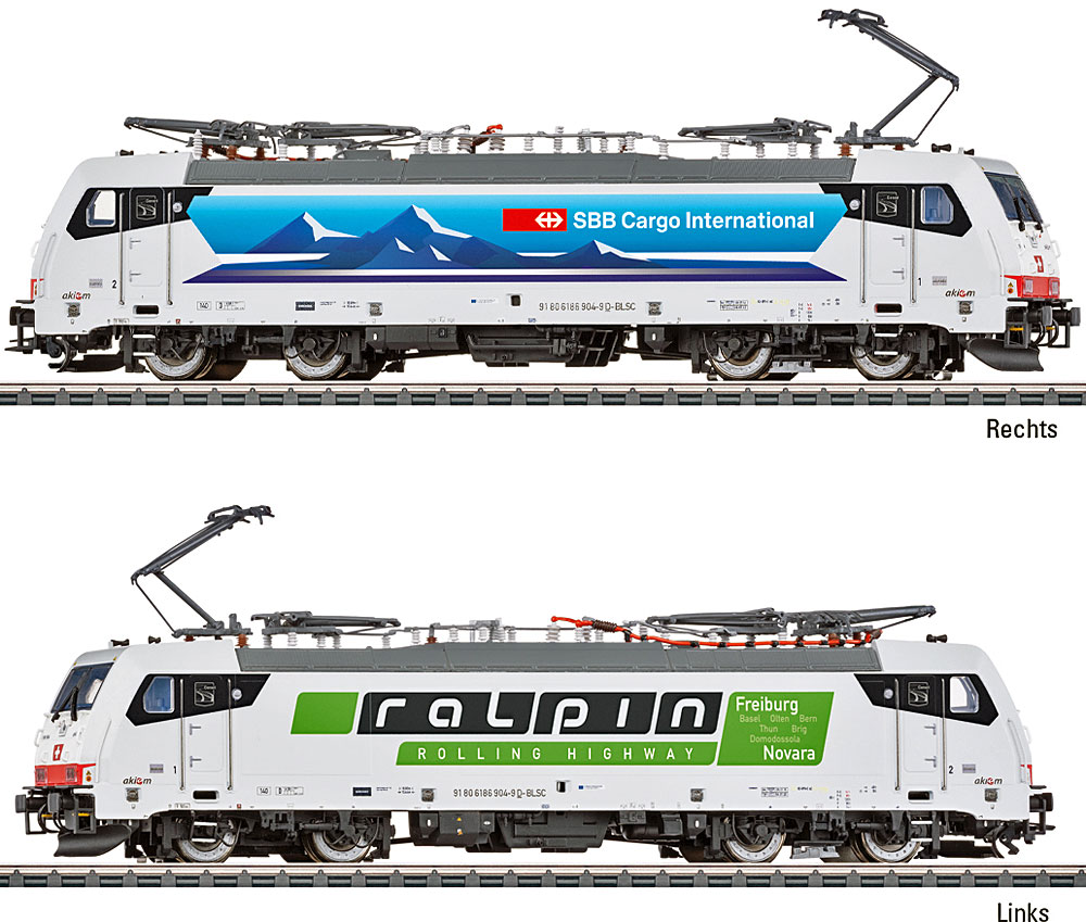 ralpin Lok BR 186 904-9 Ceneri. Betriebszustand ab 2022 der Akiem SAS, vermietet an die SBB Cargo International. Lichtgraue Grundfarbgebung mit zwei unter-schiedlich gestalteten Seitenflächen. |