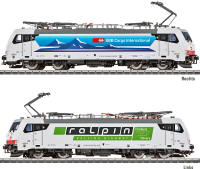 SBB Cargo Ae 610 519-1 mit Kantonswappen Giubiasco. Betriebszustand ab 2005 Mit Digital-Decoder mfx+ und umfangreichen Geräuschfunktionen. Geregelter Hochleistungsantrieb mit Schwungmasse zentral eingebaut. Je zwei Achsen in beiden Drehgestellen angetrieben. Haftreifen. Fahrtrichtungsabhängig wechselndes Dreilicht-Spitzensignal und ein weißes Schlusslicht (Schweizer Lichtwechsel) konventionell in Betrieb, digital schaltbar. Weitere separat schaltbare Lichtfunktionen: Umschalten auf ein rotes Schlusslicht, umschalten auf zwei rote Schlusslichter, umschalten auf Warnsignal und Rangierlicht. Führerstands- und Maschinenraumbeleuchtung separat digital schaltbar. Beleuchtung mit wartungsfreien warmweissen und roten Leuchtdioden (LED). Mit Pufferspeicher. Viele angesetzte Details wie Griffstangen aus Metall. Kurzkupplungskinematik. Geschlossene Blenden für den Schienenräumer liegen als separat ansteckbare Teile bei. Länge über Puffer 21 cm |