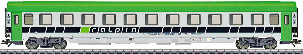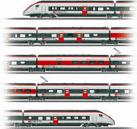 Österreich vorgesehen. Modell: 7-teilige Grundgarnitur. Restaurantwagen G und die beiden links und rechts angeordneten Mittelwagen F und H sind über die Jakobs-Drehgestelle fest miteinander gekuppelt. Mit Digital-Decoder mfx+ und umfangreichen Geräusch- und Lichtfunktionen. Geregelter Hochleistungs-antrieb mit Schwungmasse im Restaurantwagen zentral eingebaut. Alle 4 Achsen in beiden Jakobs-Drehgestellen links und rechts des Restaurantwagens über Kardan angetrieben. Haftreifen. Führerstände der Endwagen mit Inneneinrichtung. Fahrtrichtungsabhängige Stromversorgung über den jeweils vorderen Endwagen. Kulissenführung in den Jakobs-Drehgestellen Fahrtrichtungsabhängig wechselndes Dreilicht-Spitzensignal und zwei rote Schlusslichter, konventionell in Betrieb, digital schaltbar. Umschaltbar auf ein weisses Schlusslicht Schweizer Lichtwechsel. Weitere separat schaltbare Lichtfunktionen. Serienmässig eingebaute Innenbeleuchtung. Innenbeleuchtung wird versorgt über die durchgehende elektrische Verbindung des ganzen Zuges. Zusätzlich Führerstand- und Fahrpult-Beleuchtung jeweils separat digital schaltbar. Gesamte Beleuchtung mit wartungsfreien warmweissen und roten Leuchtdioden (LED). Einholmstromabnehmer auf den Mittelwagen D, F und H jeweils als Digital-Funktion separat heb- und senkbar. Massstäbliche Nachbildung. Befahrbarer Mindestradius 360 mm. Länge der Grundgarnitur ca. 152 cm. Auf einen Blick: Serienmässig eingebaute LED-Innenbeleuchtung Führerstand- und Fahrpult-Beleuchtung digital schaltbar Zug-Nummer RABe 501 004 |