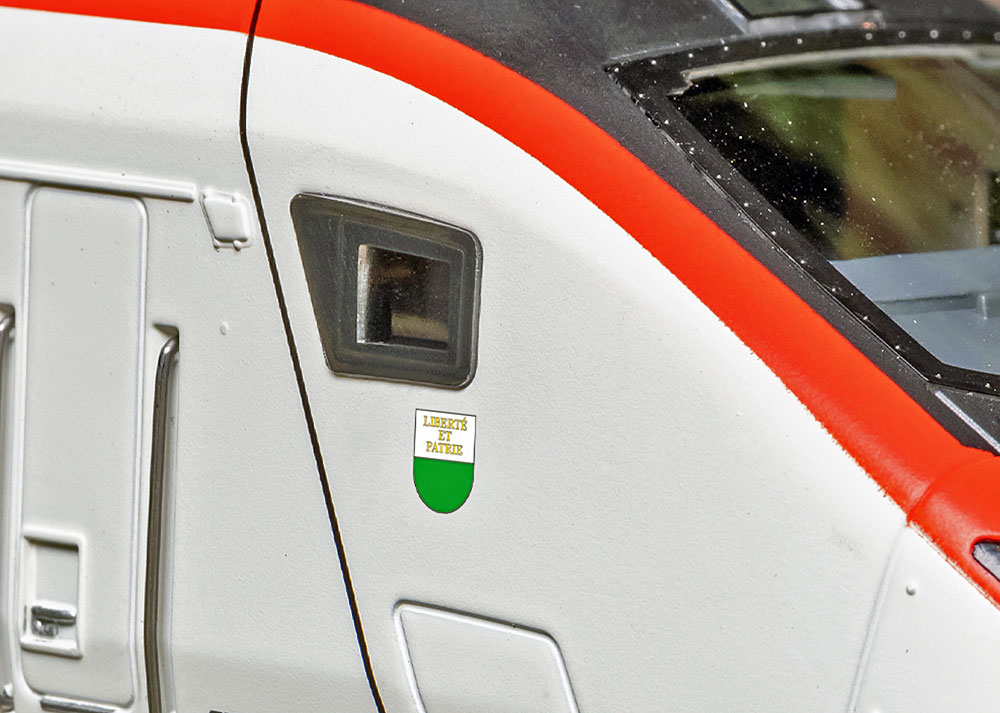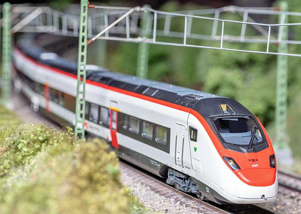 Vorbild : Elektrischer Hochgeschwindigkeits-Triebzug EC 250 als RABe 501 Giruno der Schweizerischen Bundesbahnen (SBB). 1 Endwagen A (Bt1),2. Klasse. 1 Mittelwagen F (B7), 2. Klasse, mit behindertengerechten Einstiegen und Stromabnehmer. 1 Mittelwagen G (WR6), mit Restaurant-Bereich. 1 Mittelwagen H (A5), 1. Klasse, mit Behinderten-Einstiegen und Stromabnehmer. 1 Endwagen L (At2), 1. Klasse. Mehrsystem-Triebzug. Nachbildung des EC 151, mit grenzüberschreitendem Zuglauf: Frankfurt/Main – Freiburg – Basel – Zürich – Milano Centrale. Zug-Nummer RABe 501 022, mit Wappen des Kantons Vaud. Betriebszustand um 2024. |
