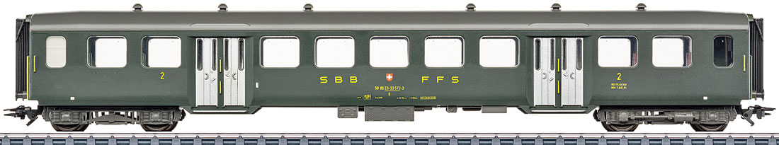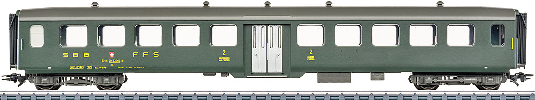SBB Leichtstahlwagen 2. Klasse mit zweimal dreiflügeligen Türen und zwei Einstiegen je Seite. Farbgebung Tannengrün. Betriebszustand um 1990.