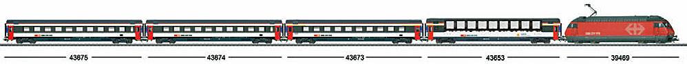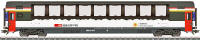 SBB Personenwagen-Set Swiss Express Vier Einheits-Personenwagen Typ EW III Betriebszustand ab 1975 Ein Halbgepäckwagen Bauart AD, 1. Klasse ein Speisewagen Bauart WR und zwei Grossraumwagen Bauart B 2.Klasse. Kieselgrau/Blutorange Grundfarbgebung des Swiss Express Zuglauf: Genève-Lausanne-Bern-Zürich HB. Wagen-Ordnungsnummern 1, 13 und 14. Speisewagen ohne Ordnungsnummer. Schlusswagen mit Zugschluss-beleuchtung und beiliegender Imitation einer automatischen Kupplung Serienmässig eingebaute LED-Innen beleuchtung mit Pufferkondensatoren Grundpackung 42190 mit einer Digitalschnittstelle im Speisewagen ausstatten werden. Durch Einsetzen eines Funktionsdecoders können die stromführenden Kurzkupplungen, die Innenbeleuchtung im Sitzbereich, die Beleuchtung der Küche sowie die Tischlampen jeweils separat digital geschaltet werden. Die Stromaufnahme für den Zugverband erfolgt dadurch am Speisewagen und nicht am Wagen mit dem Schlusslicht |