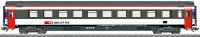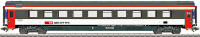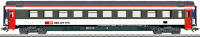 SBB Personenwagen-Set Swiss Express Betriebszustand ab 1975. zwei Einheits-Personenwagen Typ EW III Ein Grossraumwagen Bauart A, 1. Klasse und ein Grossraumwagen Bauart B, 2. Klasse. Kieselgrau/Blutorange Grundfarbgebung des Swiss Express. Zuglauf: Genève – Lausanne – Bern – Zürich HB. Wagen-Ordnungsnummern 2 und 12. Komplette Neukonstruktion der EW III-Wagenfamilie. Mehr-farbige Inneneinrichtungen. Beide Wagen mit serienmässig eingebauter LED- Innenbeleuchtung. In jedem Wagen ist ein Pufferkondensator zur