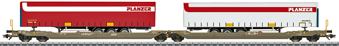 Hupac Rollende Landstrasse 2-teiliges Set Zwei Niederflurtransport-wagen Bauart Saadkmms der RAlpin AG (Olten), für den Transitverkehr der Rollenden Landstrasse. Quarzgraue Grundfarbgebung. Betriebszustand ab 2018. |