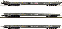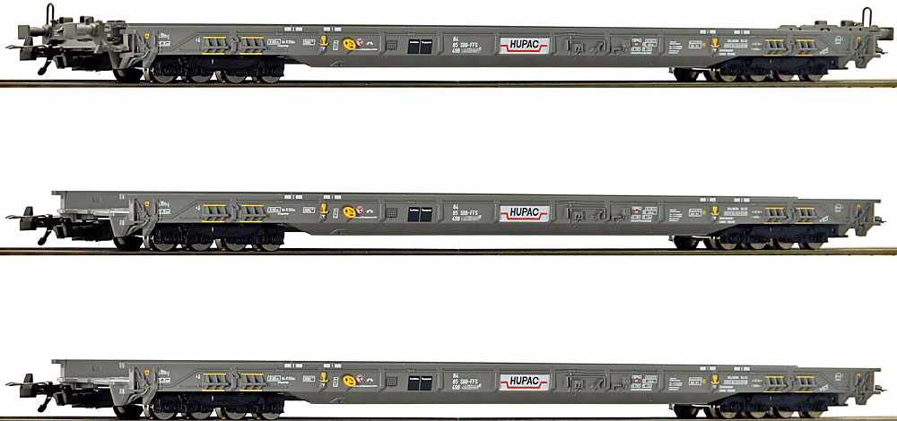 HUPAC 3-teilig Set: Rollende Autobahn Wagenset bestehend aus drei 8-achsigen Niederflurwagen für Lastwagen- und Sattelzug-Transporte der HUPAC. Ein Niederflurwagen mit beiliegenden Pufferbohlen Ganzzug geeignet Passender Ergänzungswagen zur Nachbildung eines vorbildgerecht langen Zuges unter Art.-Nr. 6600093 |