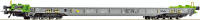 SBB Cago Containerwagen Sgnss Beide Wechselbrücken unterschiedlich bedruckt – Logo an verschiedenen Positionen Ein Wechselbrücke mit farbiger Werbung an Front |