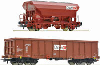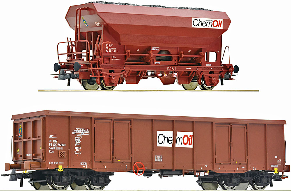 Wageset mit zwei Güterwagen mit Chemoil-Beschriftung. Bestehend aus einem 4-achsigen offenen Güterwagen, Gattung Eas und einem Selbstentladewagen, Gattung Fcs. Lackierung in unterschiedlichen Brauntönen Zwei unterschiedliche Wagentypen mit leicht unterschiedlichen brauntönen die mit Anschrift der ChemOil verkehren. Der Kieswagen ist auch nach über 10 Jahren noch immer im gleichen Zustand in der Schweiz anzutreffen. |