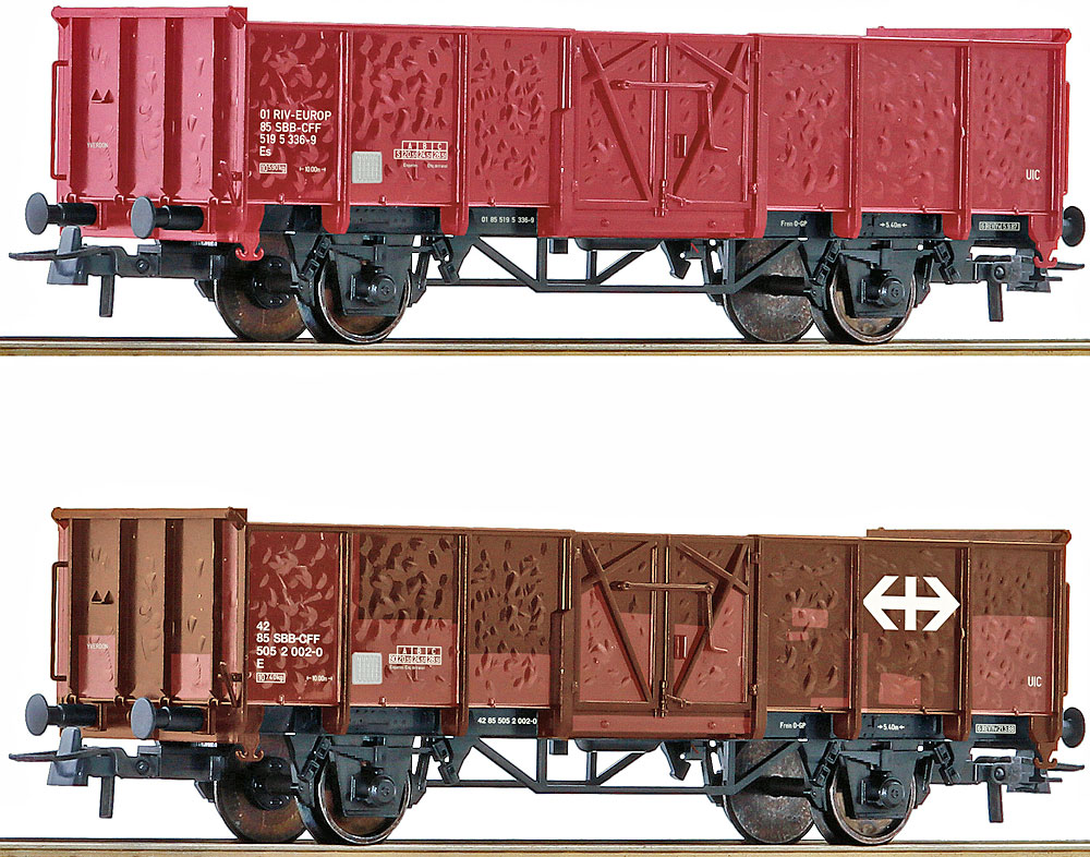 SBB Wagenset mit zwei 2-achsigen offenen Güterwagen Bauart L7. Bestehend aus einem Wagen in rotbrauner Farbgebung, Gattung Es und einem Wagen mit Ausbesserungsflecken, Gattung E. Mit verbeulten Seitenwänden Ein Wagen mit zeitgenössischer EUROP-Beschriftung |