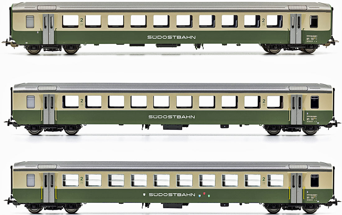 Wiederauflage Geänderte Beschriftung neue Revisionsdaten und in Epoche VI BLS EW I Wagen GOLDENPASS Ep. VI Das Set besteht aus zwei 1.-Klassewagen ex B mit Aussenschwingtüren, einem gemischten 1./2. Klassewagen mit Falttüren und zwei Wagen 2. Klassewagen mit Falttüren. Alle Wagen besitzen ab Werk eine Innenbeleuchtung. |