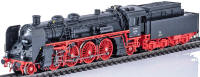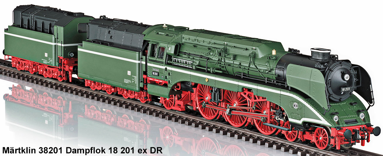 Dampflokomotive 18 201 Vorbild: Schnellzug-Dampflokomotive 18 201 mit Öl-Hauptfeuerung und Zusatztender. Ehemalige Lokomotive der Deutschen Reichsbahn der DDR (DR/DDR), welche als Versuchslokomotive der VES-M Halle (Saale) aus Teilen der 61 002 und der H45 024 entstand. Betriebszustand um 2017, wie sie vor Sonderzügen eingesetzt wurde.Modell: Mit Digital-Decoder mfx+ und umfangreichen Licht- und Soundfunktionen. Geregelter Hochleistungsantrieb mit Schwungmasse im Kessel. 3 Achsen angetrieben. Haftreifen. Lokomotive und Tender weitgehend aus Metall. Serienmäßig eingebauter Raucheinsatz, mit geschwindigkeits-abhängigem, dynamischem Rauchausstoss,digital schaltbar. Fahrtrichtungsabhängig wechselndes Dreilicht-Spitzensignal konventionell in Betrieb, digital schaltbar. Zusätzlich sind vorne an der Lok zwei rote Lampen digital schaltbar. Führerstands- und Fahrwerkbeleuchtung sowie Feuerbüchsen ckern separat digital schaltbar. Beleuchtung mit wartungsfreien warmweissen und roten Leuchtdioden (LED). Verstellbare Kurzkupplung mit Kinematik zwischen Lok und Tender. Am Tender kinematikgeführte, stromführende Kurzkupplung mit NEM-Schacht zur Schaltung der Spitzenbeleuchtung am Zusatztender. Pufferhöhe an Lok und Tender nach NEM. Zusatztender beidseitig mit trennbaren,stromf-ührenden Kurzkupplungen ausgestattet. Über einen Kippschalter im Tenderboden kann die Seite der Spitzenbeleuchtung ausgewählt werden. Diese ist über den Decoder der Lokomotive digital schaltbar. Befahrbarer Mindestradius 360 mm. Für grosse Radien oder Vitrine liegt eine Verkleidung ohne Radausschnitt unterhalb des Führerhauses zum Austausch bei. Kolbenstangenschutz-rohre, Heiz- und Bremsschläuche liegen ebenfalls bei. Gesa mtlänge über Puffer ca. 40,8 cm. |