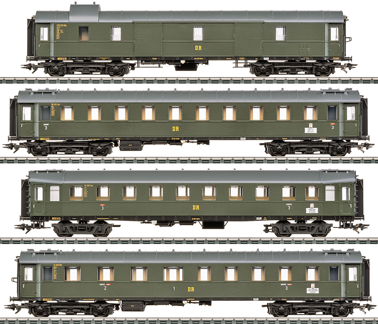 Schnellzugwagen-Set zur Dampflok BR 19.0 Sachsenstolz 4 Schnellzugwagen der Einheitsbauart 1928-30 und 1923 Hecht der Deutschen Reichsbahn der DDR (DR/DDR). 1 Schnellzug-Gepäckwagen Pw4ü-29. 1 Schnellzugwagen C4ü-28, 3. Klasse, Ordnungsnummer 1. 1 Schnellzugwagen C4ü-23 Hecht, 3. Klasse, Ordnungsnummer 2. 1 Schnellzugwagen ABC4ü-29, 1./2./3. Klasse, Ordnungsnummer 4. Zuglauf für den Schnellzug D 11: Dresden-Warnemünde, mit Kurswagen Praha-Kobenhavn Wagen mit Ordnungsnummer 4. Alle Wagen in flaschengrüner Grundfarbgebung. Betriebszustand Epoche IIIa, Anfang der 1950er Jahre. |