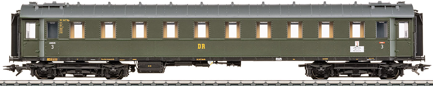 Zusatzwagen Schnellzugwagen C4ü (C4ü-28), 3. Klasse, Einheitsbauart 1928-30 der Deutschen Reichsbahn der DDR (DR/DDR). Ordnungsnummer 3. Zuglauf für den Schnellzug D 11: Dresden-Warnemünde. Flaschengrüne Grundfarbgebung. Betriebszustand Epoche IIIa, Anfang der 1950er Jahre. Massstäbliche Ausführung in 1:87. Stirnseitig angesetzte Aufstiegsleitern. Separat angesetzte Griffstangen. Passender Personenwagen als Ergänzung zum Schnellzug D 11 mit der Schnellzug-Dampflokomotive BR 19.0 Sachsenstolz |