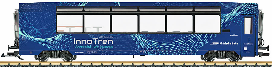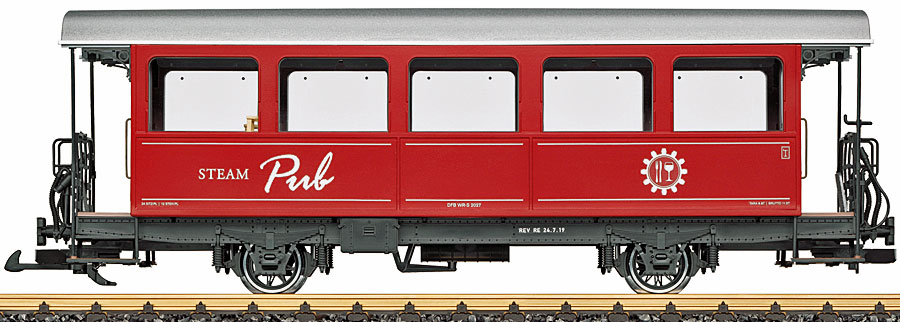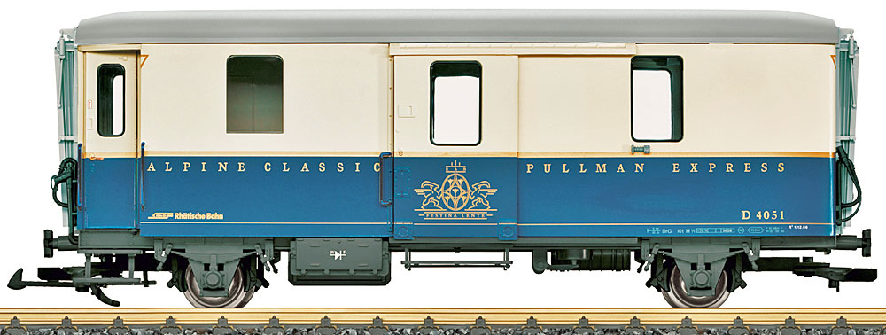 RhB Panoramawagen Speisewagen Modell des Servicewagens, wie er heute im modernen Glacier Express im Einsatz ist. Originalgetreue Farbgebung und Beschriftung in der neuesten Ausführung der Epoche VI. Vorbildgetreue Inneneinrichtung, Innenbeleuchtung mit Leuchtdioden. Länge über Puffer 68 cm. |