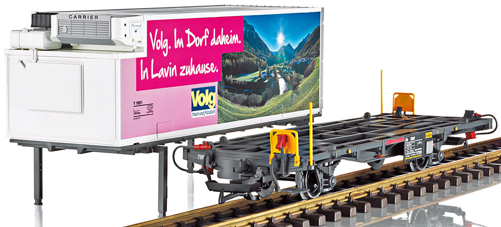 RhB Containerwagen Modell eines Containerwagens der Bauart Sb-t der Rhätischen Bahn. Ausführung eines Wagens mit Handbremskurbel an der Bühne. Originalgetreue Farbgebung und Beschriftung der Epoche VI. Beladen mit einem Container der schweizerischen Post in aktueller Gestaltung Matterhorn. Metallradsätze Wiederauflage |
