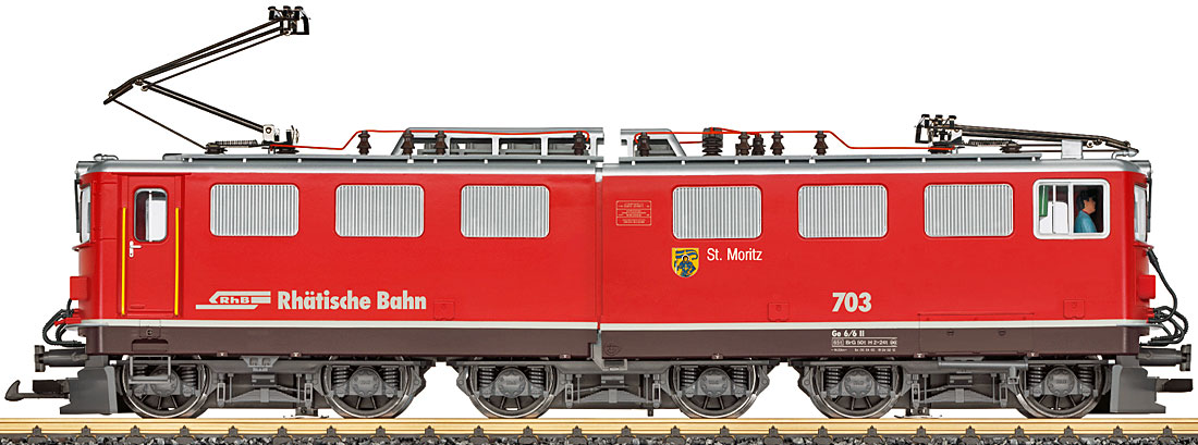 RhB Ge 6/6 II 703 rot St. Moritz. Originalgetreue Farbgebung und Beschriftung der Epoche VI wie die Maschine bis zuletzt gefahren ist. Untere Scheinwerfer in eckiger Bauform. Vier Radsätze von zwei leistungsstarken kugelgelagerten Bühler-Motoren angetrieben. Ausgerüstet mit einem mfx/DCC-Decoder mit vielen Licht- und Soundfunktionen. Einholm-Stromabnehmer motorisch angetrieben, digital heb- und senkbar. Korrekte Nachbildung des Gelenks in der Lokmitte. Länge über Puffer 65 cm. |