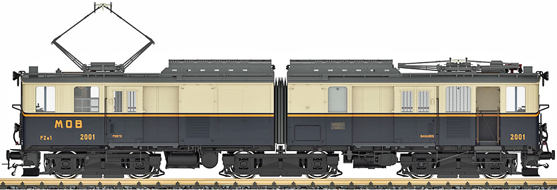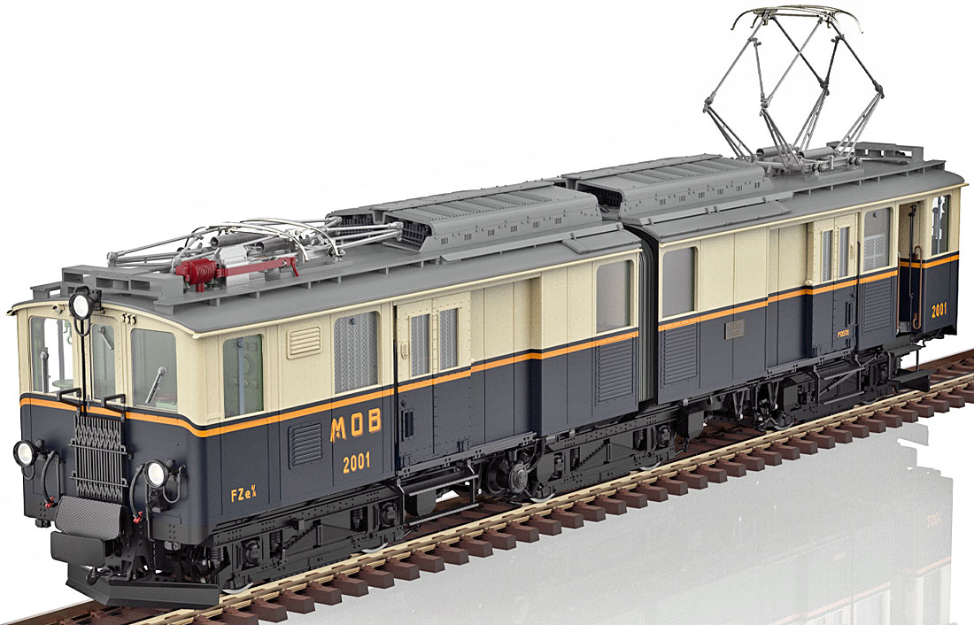 MOB FZe 6/6 2001 Ep II Das Modell dieses Gelenktriebwagens wird nun im Massstab 1 : 22,5 in Metall als Highend-Modell gefertigt. Das Modell ist wie von unseren anderen Highend-Modellen in einem sehr hohen Detailgrad. Farbgebung und Bedruckung in der Epoche II. entsprechende Stromabnehmer und Dach-aufbauten. Farbgebung und Bedruckung des FZe 6/6 2001 sind im Zustand seiner Ablieferung bei der SIG / BBC bzw. seiner Indienststellung bei der MOB um 1933 ebenso Ein mfx/DCC-Sounddecoder mit verschiedenen Licht- und Soundfunktionen, wie z.B. dem Schweizer Lichtwechsel, einer Führerstands- und Innenbeleuchtung, digital heb- und senkbare Stromabnehmer und vieles mehr, sorgen für hohen Spielwert beim Betrieb des 76 cm langen Modells, welches auch den Radius R1 problemlos befahren kann. HIGEND Modell |