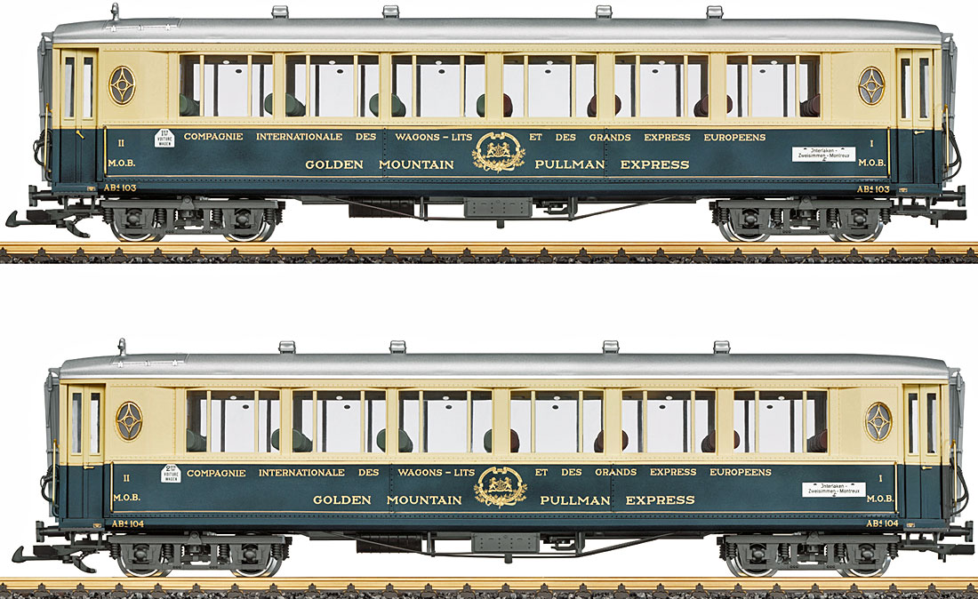 MOB Personenwagen-Set 1 Golden Mountain Pullman Express Personenwagen-Set bestehend aus zwei Wagen des Golden Mountain Pullman Express der CIWL, wie sie bei der MOB in den 30er-Jahren im Einsatz waren. Original-getreue Farbgebung und Beschriftung der Epoche II. Detaillierte Inneneinrichtung, Innenbeleuchtung serienmässig eingebaut. Türen zum Öffnen Ergänzungen zu den Highend-Modellen |