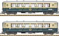 MOB Personenwagen-Set 2 Golden Mountain Pullmann Express Personenwagen-Set bestehend aus zwei Wagen des Golden Mountain Pullman Express der CIWL, wie sie bei der MOB in den 30er-Jahren im Einsatz waren. Original-getreue Farbgebung und Beschriftung der Epoche II. Kom-plette feindetaillierte Inneneinrichtung, Innenbeleuchtung serienmässig eingebaut. Türen zum Öffnen. Metallradsätze. Länge über Puffer je Wagen 66 cm. |