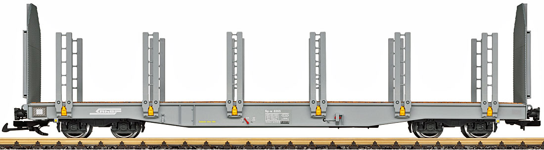 RhB Doppelrungenwagen Modell eines Doppelrungenwagens der Bauart Sp-w der RhB. Originalgetreue Farbgebung und Beschriftung der Epoche VI. Hohe Stirnwände, die beim Vorbild der Ladungs-sicherung dienen. Ohne Bremserbühne, mit seitlich angebrachtem Handbremsrad. Länge über Puffer 66 cm.