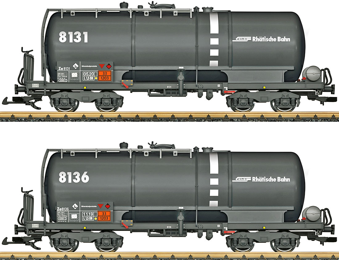 RhB Kesselwagen-Set Serie Za. Originalgetreue Farbgebung und Beschriftung der Epoche VI. Betriebsnummer Za 8131 und Za 8136. Der Kessel lässt sich befüllen und entleeren. Metallradsätze. Länge über Puffer pro Wagen 48 cm.