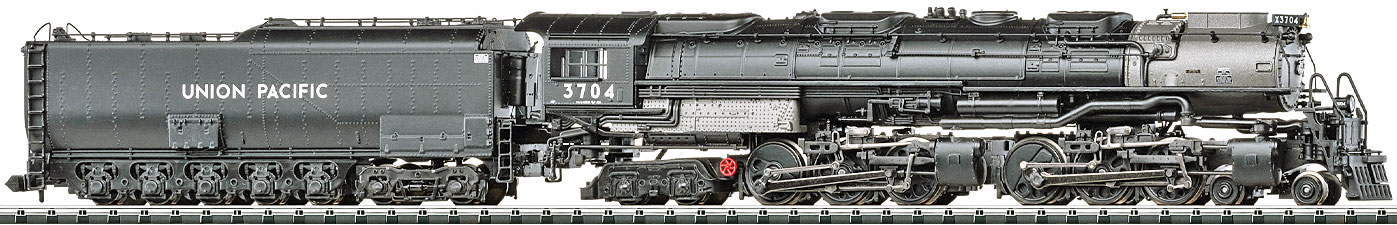 USA-Güterzug-Dampflokomotive UP Union Pacific Railroad der Klasse 3700 Challenger Betriebsnummer 3704 in der Umbau-Version mit Öl-Tender Ausführung der Lokomotive mit der Betriebszustand der 1950er-Jahre. Mit Digital-Decoder und umfangreichen Geräuschfunktionen. Geregelter Hochleistungsantrieb. 6 Achsen angetrieben. Haftreifen, Rauchgenerator. Fahrtrichtungsabhängig wechselndes Spitzensignal, Nummerntafeln und Rauchgenerator konventionell in Betrieb, digital schaltbar. Führerstandsbeleuchtung digital schaltbar. Beleuchtung mit wartungsfreien warmweissen Leuchtdioden LED. Kurvengängiges Gelenkfahrwerk. Boxpok-Räder. Mindestradius R2a 261,8 mm. Länge über Kupplungen ca. 23 cm. Einmalige Serie |